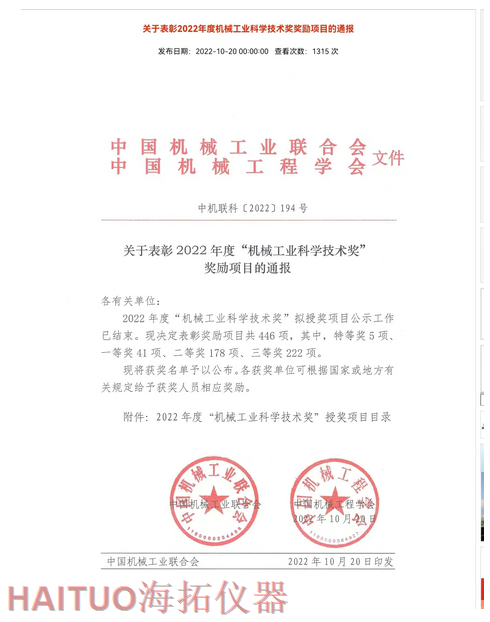 海拓儀器榮獲2022年度中國機械工業(yè)科學(xué)技術(shù)獎?ICC訊?10月20日,2022年度“中國機械工業(yè)科學(xué)技術(shù)獎”項目名錄正式發(fā)布,由海拓儀器(江蘇)有限公司完成的“超快速冷熱沖擊試驗系統(tǒng)關(guān)鍵技術(shù)研究與系列應(yīng)用”項目榮獲2022年度“中國機械工業(yè)科學(xué)技術(shù)獎”三等獎。??據(jù)了解,中國機械工業(yè)科學(xué)技術(shù)獎是根據(jù)《國家科學(xué)技術(shù)獎勵條例》和《社會力量設(shè)立科學(xué)技術(shù)獎管理辦法》的有關(guān)規(guī)定,由中國機械工業(yè)聯(lián)合會和中國機械工程學(xué)會共同設(shè)立并經(jīng)國家科學(xué)技術(shù)部批準(zhǔn),在國家科技獎勵主管部門登記的面向全國機械行業(yè)的綜合性科技獎項。旨在表彰在機械工業(yè)科技工作中作出突出貢獻(xiàn)的單位和人員,獎勵范圍包括:機械工業(yè)科學(xué)技術(shù)發(fā)明成果、機械工業(yè)科學(xué)技術(shù)進(jìn)步成果、機械工業(yè)工程化和新技術(shù)推廣成果和機械工業(yè)軟科學(xué)和標(biāo)準(zhǔn)成果。??海拓儀器是一家集研發(fā)、制造、貿(mào)易于一體高科技現(xiàn)代化公司,公司成立于2005年,主要產(chǎn)品包括:超快速冷熱沖擊試驗機(熱流儀)、快速溫變應(yīng)力篩選試驗箱(ESS), -